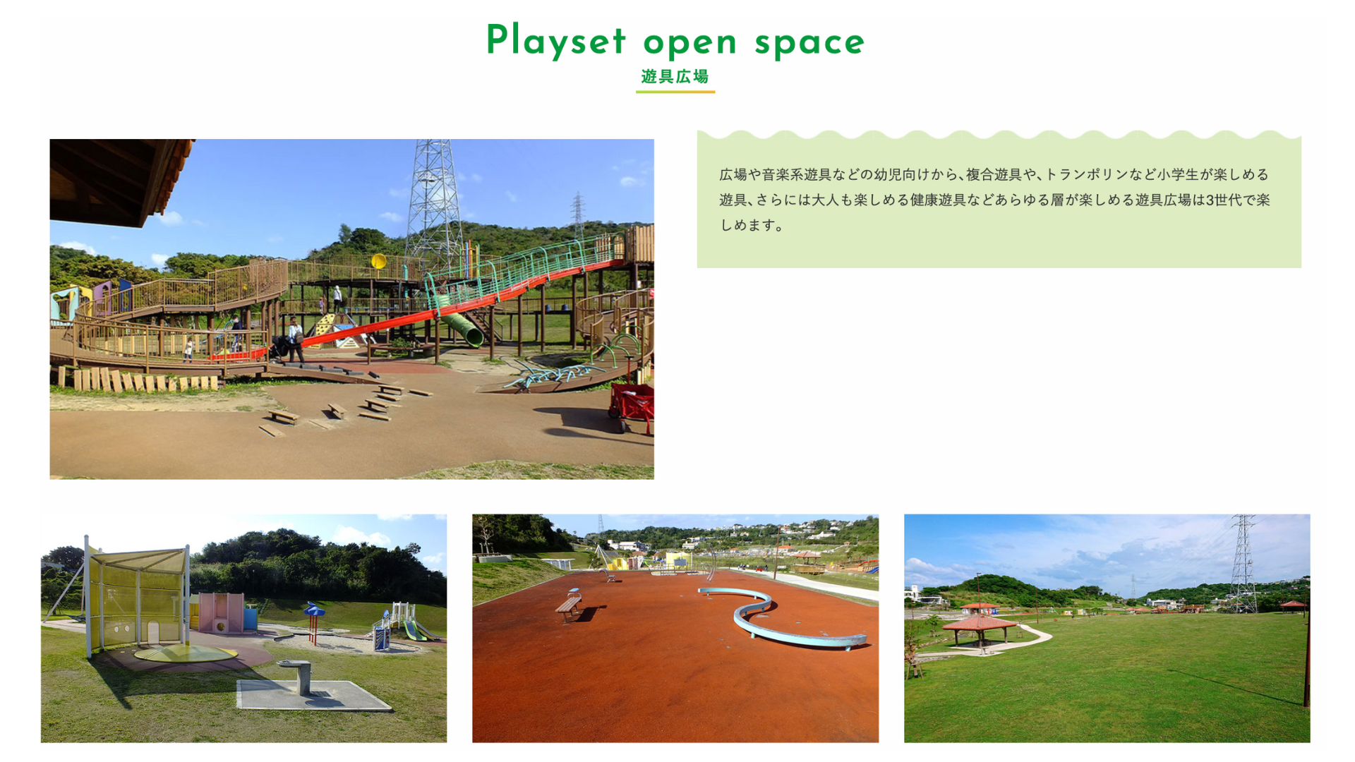 複合遊具などの小学生が楽しめる遊具から大人も楽しめる健康遊具などがあるので、3世代で楽しめる場所です。