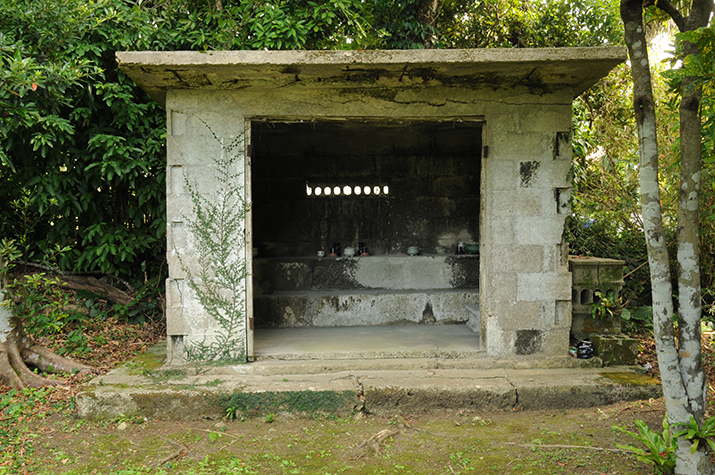 喜舎場集落の北側丘陵の頂上付近にある、琉球石灰岩の岩陰を塞いで造られた墓である。